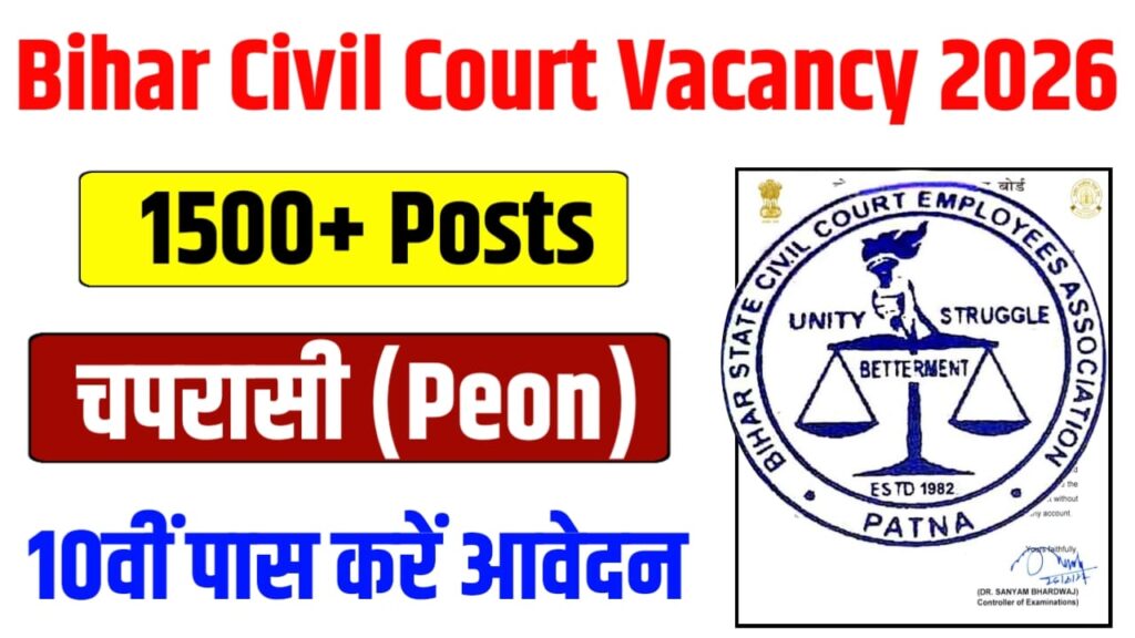 Bihar Civil Court Peon Vacancy 2026 : बिहार सिविल कोर्ट में कक्षा दसवीं पास युवाओं को भर्ती होने का एक और मौका बहुत जल्द ही मिलने जा रहा है। बिहार सिविल कोर्ट में Peon या चपरासी के 1673 पदों पर भर्ती आने के बाद अब 1500 से अधिक नए पदों पर भर्ती को लेकर अधिसूचना जारी होने वाला है। इस भर्ती के लिए 10वीं पास युवा आवेदन कर पाएंगे। जानकारी के लिए बता दें बिहार सिविल कोर्ट भर्ती 2024 के तहत चपरासी प्यासा कर्मचारी के 1673 पदों पर भर्ती निकल गया था।