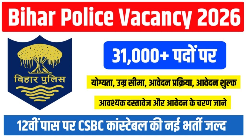 Bihar Police Constable Vacancy 2026 Update: बिहार में बिहार पुलिस सिपाही के 31000 से अधिक नए पदों पर भर्ती के लिए अधिसूचना जारी होने वाला है। कुछ रिपोर्ट में बताया जा रहा है कि लगभग 22000 से 31000 कांस्टेबल के पदों पर भर्ती आएगी और इन पदों पर भर्ती के लिए न्यूनतम शैक्षणिक योग्यता कक्षा 12वीं पास होगा।