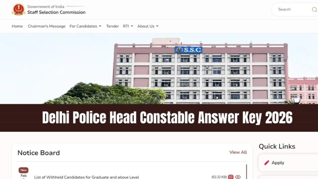 Delhi Police Head Constable Answer Key : एसएससी दिल्ली पुलिस हेड कांस्टेबल परीक्षा 2026 में शामिल होने वाले सभी अभ्यर्थियों के लिए जरूरी सूचना जारी की गई है। 7 फरवरी 2026 तक प्रोविजनल उत्तर कुंजी पर आपत्ति दर्ज करने की आखिरी तारीख तय की गई है। जितने भी अभ्यर्थियों ने परीक्षा दिया है, वह ssc.gov.in आधिकारिक वेबसाइट पर जाकर उत्तर पूंजी पर आपत्ति दर्ज कर सकते हैं। आपत्ति दर्ज करने के लिए प्रति प्रश्न शुल्क ₹50 निर्धारित किया गया है। जानकारी के लिए आपको बता दे की एसएससी दिल्ली पुलिस कांस्टेबल के उत्तर कुंजी को 5 फरवरी 2026 को शाम 6:00 सेजारी किया था।